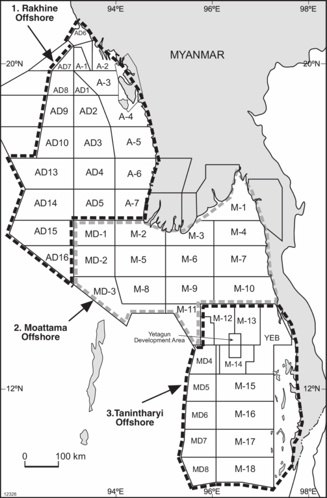 ミャンマーの主要海上ガス田の位置。ゾーティカはM-9ブロック、ヤダナはM-5およびM-6ブロックに位置し、いずれもモッタマ湾に面している。アウンシンカはM-10ブロック付近に計画されている。[Myanmar, Myo. (2021). GEOLOGICAL REPORT COLLECTION MYANMAR-2.]