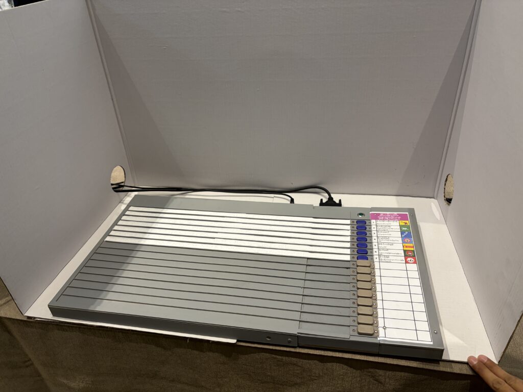 係員の合図とともに、候補者名と党のシンボルマーク、その脇にボタンが並ぶ投票盤から入れたい候補者のボタンを押す。すると、傍の箱の上の小窓に選んだ候補者名とシンボルが印字された小紙片(カード)が表示される。有権者は自分が選んだ候補者かを確認できる。カードは数秒で下の箱に落ちる仕組みだ。